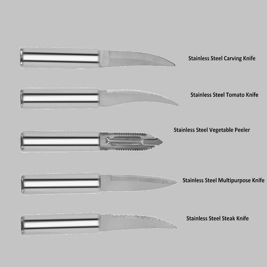 Stainless Steel Kitchen Knife Set with Wooden Block, Knife Set for Kitchen with Stand, Knife Holder for Kitchen with Stainless Steel 1 Peeler 4 Pcs Knife, Silver